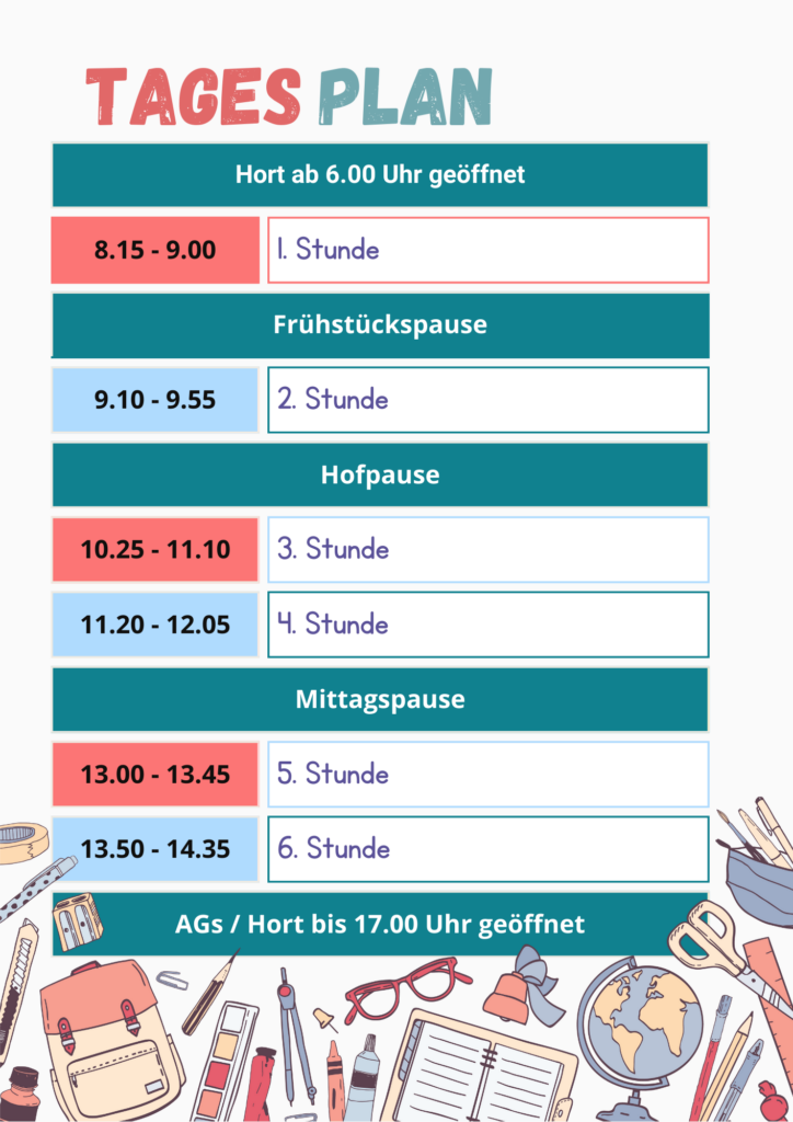 Als Ganztagsschule bieten wir eine Betreuung der Kinder von 6:00 Uhr bis 17:00 Uhr an, auch in den Ferien.