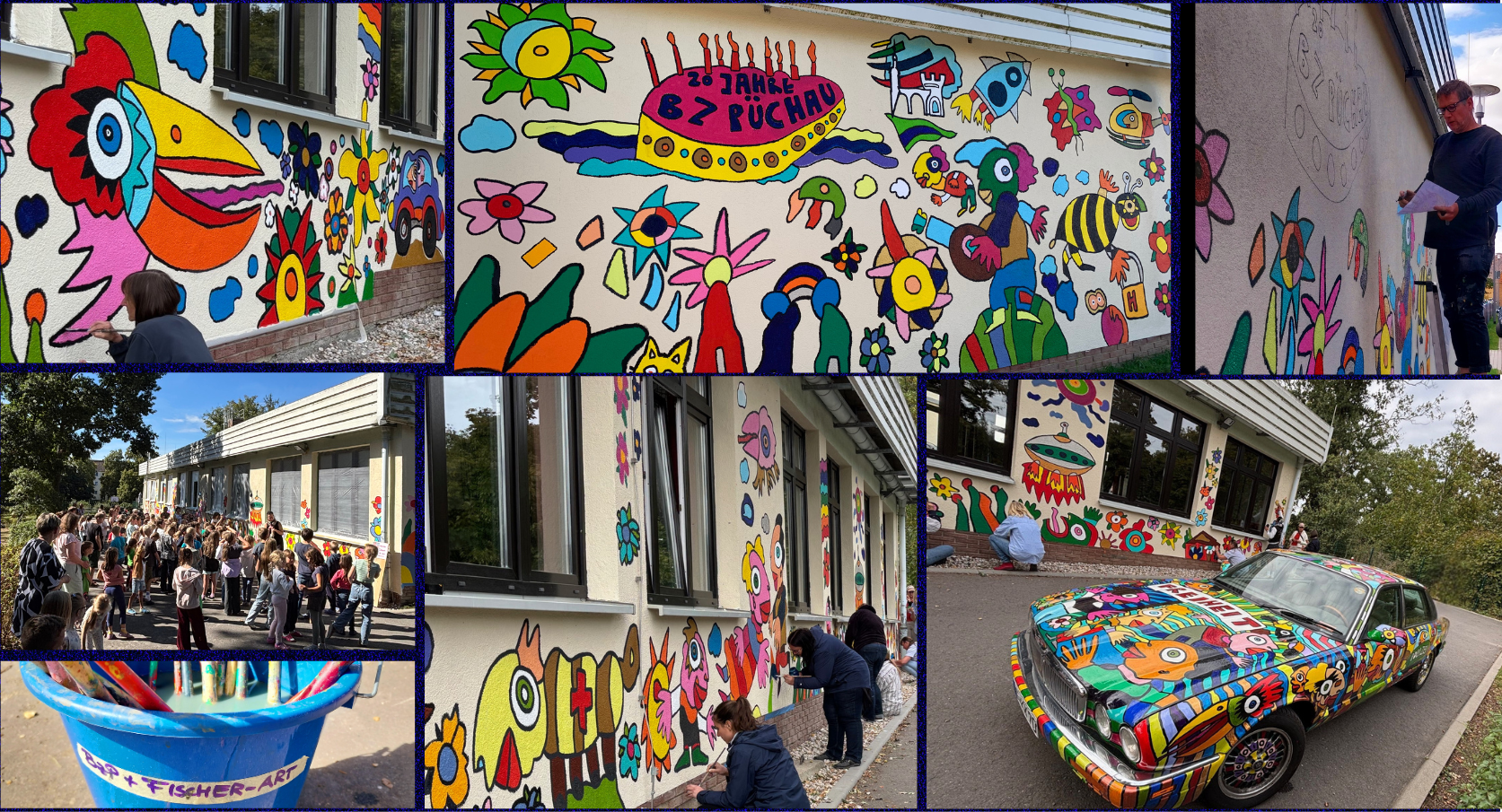 September 2025. Bereits zum Schulfest anlässlich unseres 20-jähringen Jubiläums hatten wir einen prominenten Gast in Püchau, jetzt wurde das „Mit-Mal-Projekt“ mit dem Künstler Michael Fischer-Art fortgesetzt. Am 12. September war das Außengelände der Grundschule Püchau geöffnet für alle, die unsere Schule gemeinsam mitgestalten wollten. Unter Anleitung von Herr Fischer-Art waren Kinder, Eltern und alle Püchauerinnen und Püchauer eingeladen, die Wand unserer Mehrzweckhalle mit fröhlichen Farben herrlich bunt zu gestalten. Abgeschlossen wurde das Projekt schließlich im Rahmen eines Teamevents am 17. September, als das gesamt Schul- und Hortteam noch einmal zum Pinsel griff, um dem Kunstwerk den letzten Schliff zu verpassen…