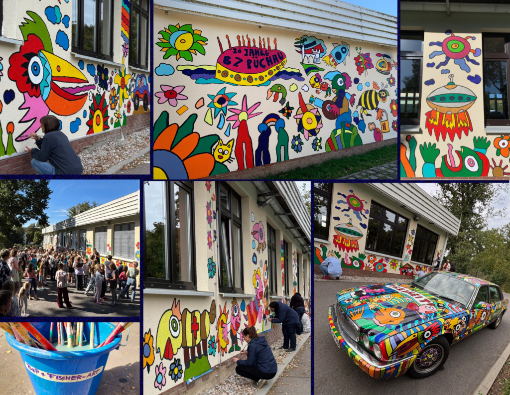 Schulhof mit Kletterwand und „Riesenschachbrett“KlassenzimmerKlassenzimmer„Lesetelefonzelle“ auf dem Schulhoffür Frühstückspausen auf dem HofSchulgarten im FrühlingHortgarten mit „Matschstraße“Sommerschule mit NaschgartenInsektenhotelSpielplatzSportplatzunsere Schule von obenDie Rückseite unserer Schule konnten wir gemeinsam mit dem Künstler Michael Fischer-Art im Rahmen unseres 20. Schuljubiläums herrlich bunt gestalten